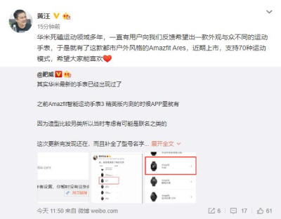 或許是沒(méi)有預(yù)想到新品會(huì)通過(guò)這種方式曝光,華米科技 CEO 黃汪隨即在微博上回應(yīng),稱:“ 華米死磕運(yùn)動(dòng)領(lǐng)域多年,一直有用戶向我們反饋希望出一款外觀與眾不同的運(yùn)動(dòng)手表,于是就有了這款都市戶外風(fēng)格的 Amazfit Ares,近期上市,支持 70 種運(yùn)動(dòng)模式,希望大家能喜歡。”