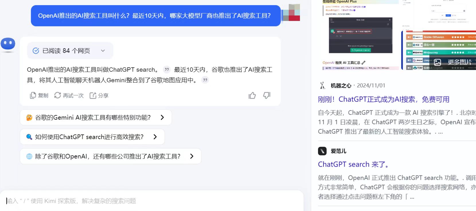 記者選擇了聯(lián)網(wǎng)搜索選項(xiàng)并嘗試向Kimi提問“OpenAI推出的AI搜索工具是什么,最近10天內(nèi)哪家大模型廠商也推出了AI搜索工具?”Kimi很快給出了“OpenAI推出的AI搜索工具叫ChatGPT search,最近10天內(nèi)谷歌也推出了AI搜索工具”的正確答案。OpenAI的介紹上看,ChatGPT search的頁面與Kimi相似,鏈接都在右邊的側(cè)邊欄中。