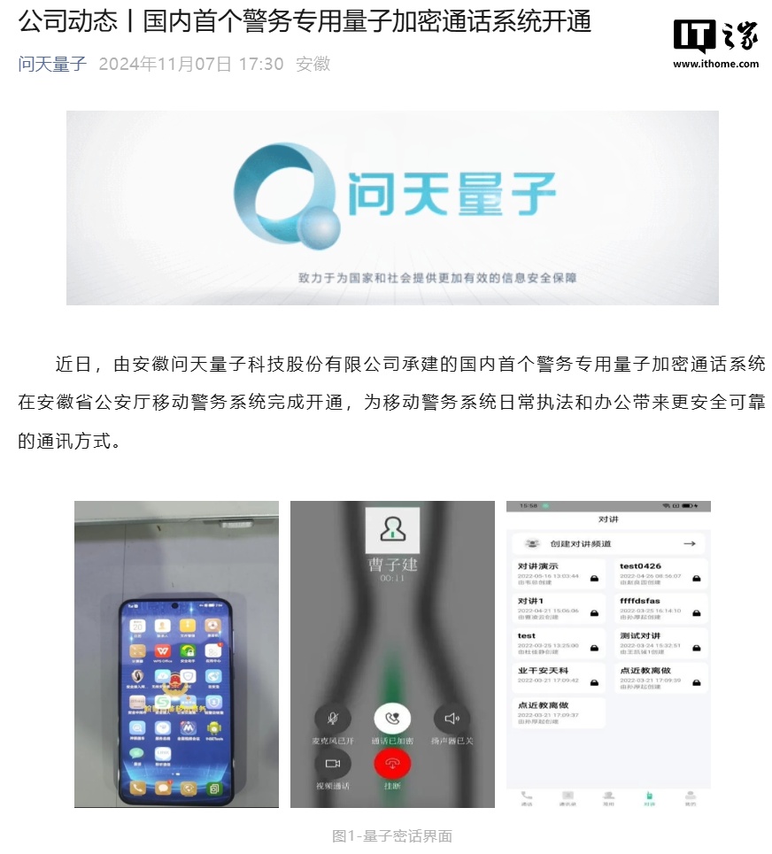 11 月 7 日消息,安徽問天量子科技股份有限公司(問天量子)今日宣布,由該公司承建的國內(nèi)首個(gè)警務(wù)專用量子加密通話系統(tǒng)在安徽省公安廳移動(dòng)警務(wù)系統(tǒng)完成開通,為移動(dòng)警務(wù)系統(tǒng)日常執(zhí)法和辦公帶來更安全可靠的通訊方式。
