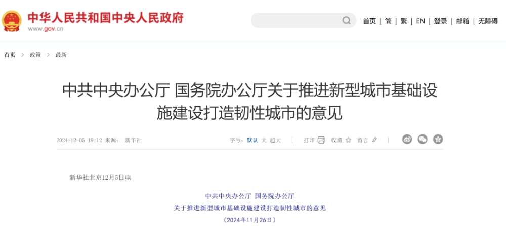 12 月 5 日晚間,中共中央辦公廳、國(guó)務(wù)院辦公廳印發(fā)《關(guān)于推進(jìn)新型城市基礎(chǔ)設(shè)施建設(shè)打造韌性城市的意見(jiàn)》(以下簡(jiǎn)稱(chēng)《意見(jiàn)》)。