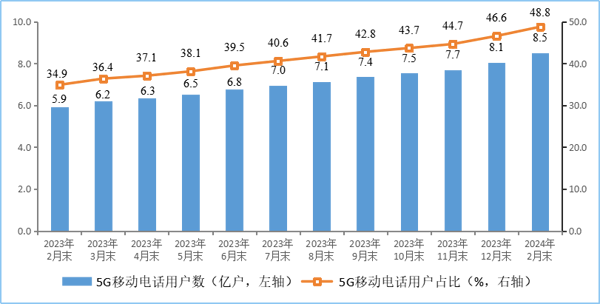 飛象網(wǎng)訊(致新/文)3月25日消息,根據(jù)工信部公布的《2024年1—2月份通信業(yè)經(jīng)濟(jì)運(yùn)行情況》顯示,截至2024年2月末,三家基礎(chǔ)電信企業(yè)及中國(guó)廣電的移動(dòng)電話用戶總數(shù)達(dá)17.46億戶,比上年末凈增240.9萬(wàn)戶。其中,5G移動(dòng)電話用戶達(dá)8.51億戶,比上年末凈增2922萬(wàn)戶;占移動(dòng)電話用戶的48.8%,占比較上年末提高2.2個(gè)百分點(diǎn)。