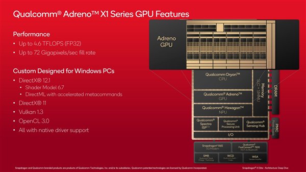 Adreno X1是專門針對(duì)Windows PC設(shè)計(jì)的,圖形接口完整支持DirectX 12.1(Shader Model 6.7/DirectML)、DirectX 11、Vulkan 1.3、OpenCL 3.0,都有原生驅(qū)動(dòng)支持。