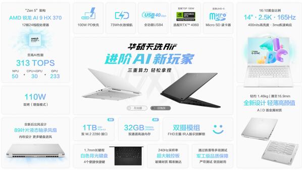 除了采用全新銳龍AI 9 HX 370平臺(tái)外,天選Air 2024還可選擇搭載銳龍7 8845H的版本,其擁有8核心16線程,至高頻率5.1GHz,配合RTX 4050/4060、2.5K 165Hz四窄邊全能屏,戰(zhàn)力同樣高能!