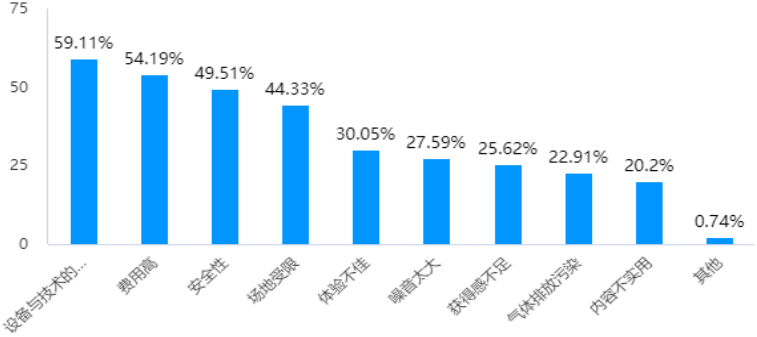 調(diào)研發(fā)現(xiàn),設(shè)備與技術(shù)的成熟度、費(fèi)用高、安全性、場(chǎng)地受限是教育培訓(xùn)場(chǎng)景下消費(fèi)者最大的顧慮因素。