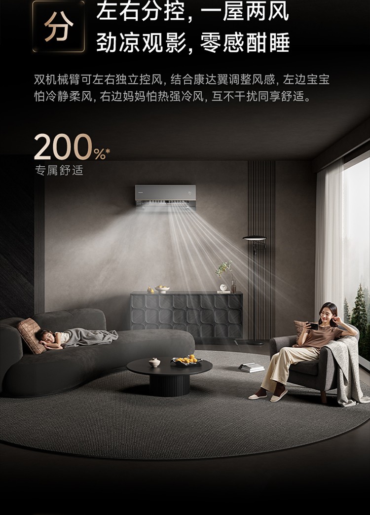 如果說0°零感微風(fēng)和126°廣域送風(fēng)是追覓機(jī)械臂空調(diào)成功敲開空調(diào)市場(chǎng)大門,那么得益于雙機(jī)械臂設(shè)計(jì)的左右分控,一屋兩風(fēng),互不干擾則將用戶體驗(yàn)提升到新檔次。以往傳統(tǒng)空調(diào)統(tǒng)一風(fēng)感模式,家庭用戶矛盾不斷!強(qiáng)風(fēng)模式,老人怕冷用戶受不了。柔風(fēng)模式,家里怕熱的男士又感覺不夠熱,這就導(dǎo)致不管空調(diào)怎么設(shè)置,家庭成員總有人不舒服。