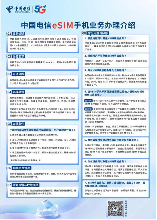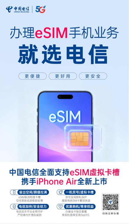 此外,啟用eSIM服務(wù)后,若用戶后續(xù)需要更換為非eSIM終端,可隨時向安徽電信申請恢復(fù)實體SIM卡服務(wù),充分滿足不同使用需求。目前,該業(yè)務(wù)僅支持大陸版iPhone Air辦理,港版、海外版本的eSIM手機終端暫不兼容。不過值得期待的是,華為、OPPO等國內(nèi)廠商的eSIM手機近期也將陸續(xù)上市銷售,未來將為用戶提供更豐富的終端選擇!