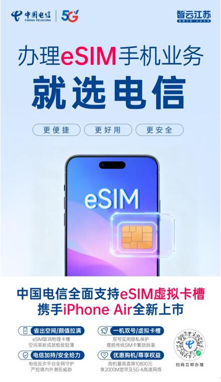 隨著工信部eSIM手機(jī)商用試驗(yàn)批復(fù)落地,中國電信在全國31個省區(qū)市同步啟動eSIM手機(jī)業(yè)務(wù),江蘇電信用戶對“無卡通信”展現(xiàn)出高度期待。自10月22日iPhone Air手機(jī)上線以來,這股通信技術(shù)革新的浪潮進(jìn)一步深度覆蓋江蘇大地,江蘇電信全面支持eSIM手機(jī)業(yè)務(wù),率先開通預(yù)約通道,截至目前,預(yù)約量突破2萬人次,業(yè)務(wù)辦理熱度居高不下。