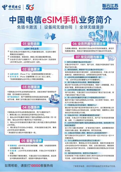 江蘇電信以eSIM手機(jī)業(yè)務(wù)的“無卡科技”賦能千萬蘇城百姓的智慧生活,以建設(shè)“智云江蘇”的數(shù)字力量,為千萬用戶的智慧生活注入通信新活力。告別傳統(tǒng)卡槽,惠享輕薄時尚!江蘇電信eSIM手機(jī)業(yè)務(wù)已全面就緒,即刻走進(jìn)身邊營業(yè)廳,擁抱“無卡”自由,暢享數(shù)字新生活!