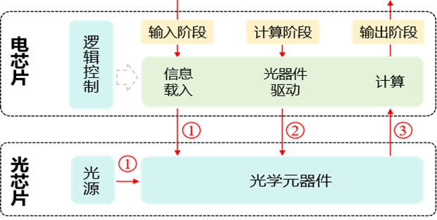 在光電混合架構(gòu)中,計(jì)算任務(wù)被拆分為線性與非線性兩部分,分別由光芯片與電芯片協(xié)同完成。其計(jì)算流程具體如下: