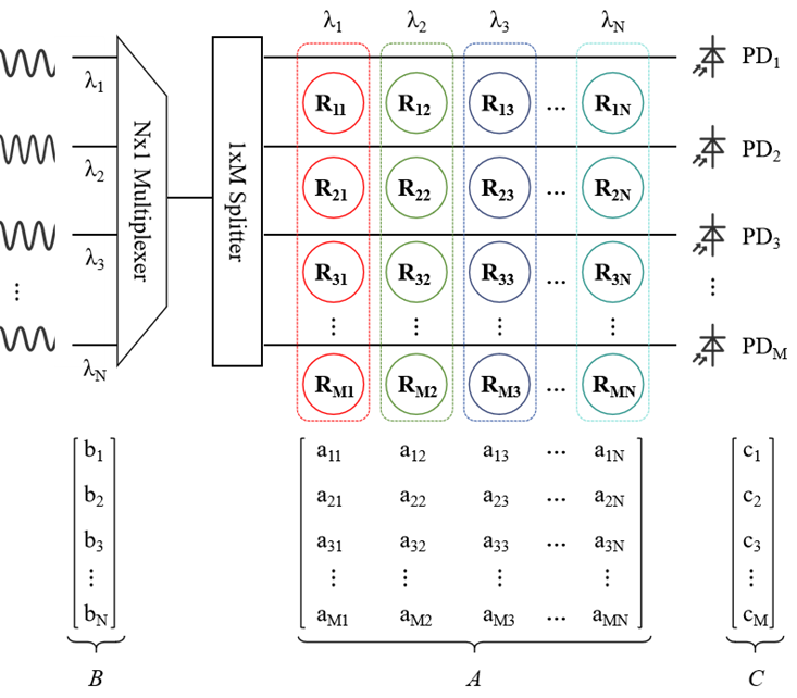 2.基于MRR陣列的矩陣向量乘法:將數(shù)學(xué)上的矩陣與微環(huán)陣列進(jìn)行同構(gòu)映射,依賴于波分復(fù)用(Wavelength Division Multiplexing, WDM)技術(shù),輸入向量中的每個(gè)元素對(duì)應(yīng)于一個(gè)具有特定頻率或波長(zhǎng)的輸入光,然后通過M×N規(guī)模的光學(xué)權(quán)重矩陣陣列對(duì)其進(jìn)行不同的幅度調(diào)節(jié),從而實(shí)現(xiàn)對(duì)輸入信號(hào)的加權(quán)。