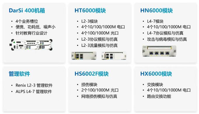 包括L2-3模塊,L4-7模塊,網(wǎng)絡(luò)損傷模塊,三層交換模塊。通過靈活配置這些模塊,可以滿足通信網(wǎng)絡(luò)與網(wǎng)絡(luò)安全專業(yè)教學(xué)中各種實(shí)驗(yàn),從而達(dá)到深挖網(wǎng)絡(luò)原理,貼近教學(xué)實(shí)踐的目的。