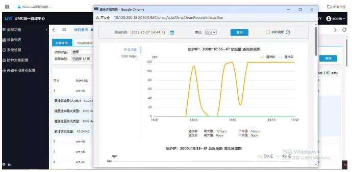 3.測試儀表發(fā)送1Gbps的混合攻擊報(bào)文,攻擊類型包括:NTP反射攻擊、Memcached反射攻擊、SSDP反射攻擊、CLDAP反射攻擊、DNS反射攻擊。攻擊和背景流量的源地址不重疊,攻擊的目的地址為背景流量部分目的IP,攻擊發(fā)送持續(xù)時(shí)間10分鐘。