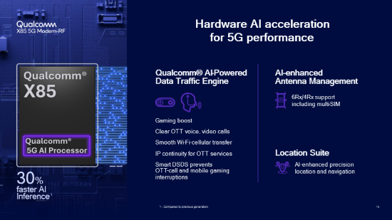 這頁(yè)幻燈片展示了高通如何利用AI提升5G性能。不久前剛剛推出的高通X85是我們最新一代5G調(diào)制解調(diào)器到天線的解決方案,搭載了高通第四代集成到調(diào)制解調(diào)器的專用AI處理器。這款處理器能夠以更高的處理性能運(yùn)行更多AI專用5G算法。比如,全新的高通AI賦能的數(shù)據(jù)流量引擎,能夠利用AI處理器,增強(qiáng)數(shù)據(jù)流量模式識(shí)別能力,為手游用戶帶來(lái)更低時(shí)延、更快響應(yīng)速度的游戲體驗(yàn)。這款處理器性能強(qiáng)大,AI推理速度相比上一代快30%。
