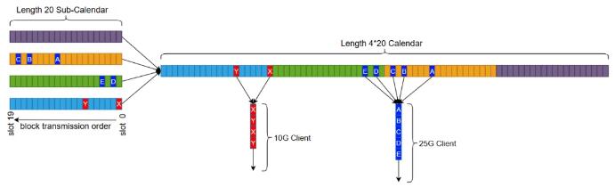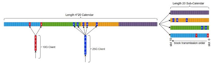 FlexE Shim 時隙配置,通過 Calendar 機制,為每個Client接口提供靈活、動態(tài)可調的配置。不同速率的Client接口,F(xiàn)lexE Shim將其業(yè)務數(shù)據(jù)按5G的顆粒度,靈活分配到業(yè)務承載通道上,實現(xiàn)多種速率接口靈活復用。