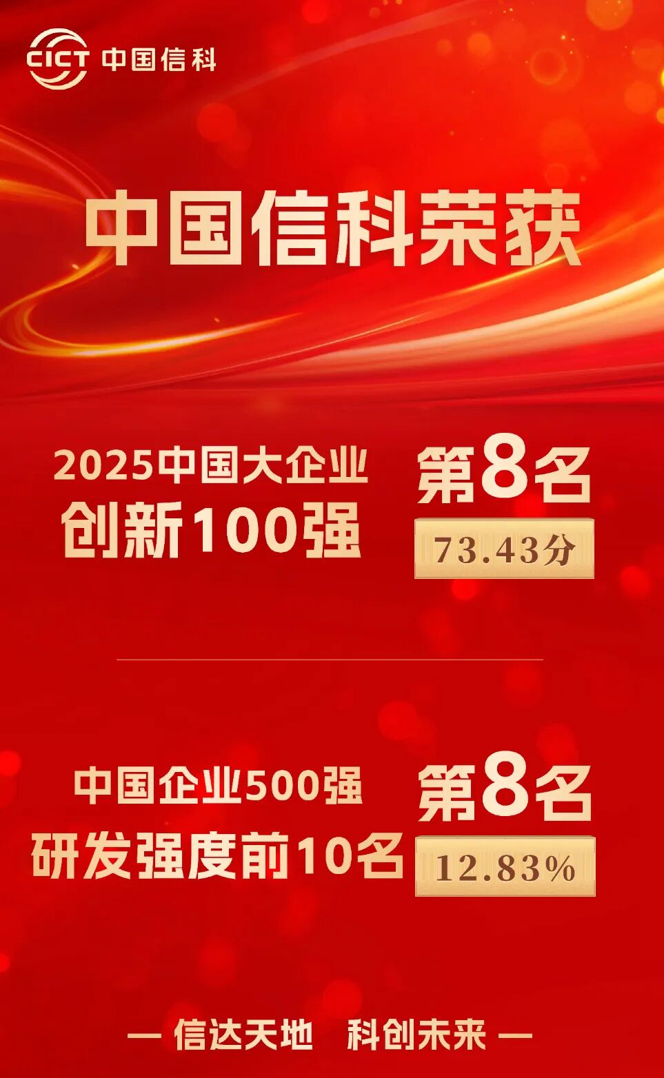 雙榜 | 中國(guó)信科入選“中國(guó)大企業(yè)創(chuàng)新百?gòu)?qiáng)”與“中國(guó)企業(yè)500強(qiáng)研發(fā)強(qiáng)度前十”