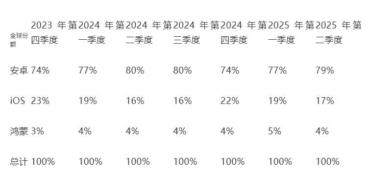 2023 年第 4 季度到 2025 年第 2 季度全球手機系統(tǒng)分布情況
