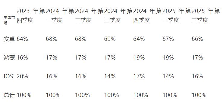 附上 2023 年第 4 季度到 2025 年第 2 季度中國手機系統(tǒng)分布圖表如下: