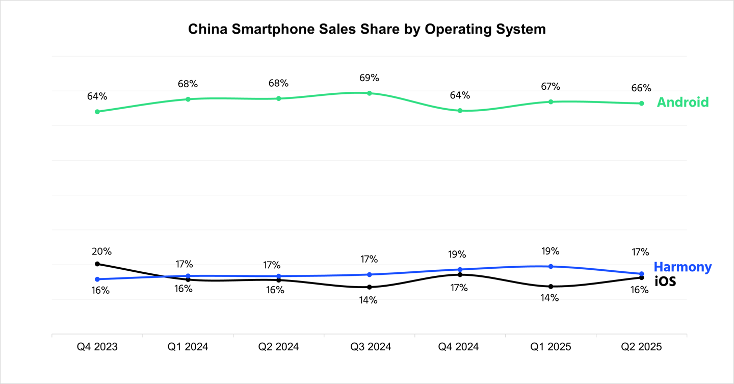 CounterPoint 報告中國手機系統(tǒng)份額:華為鴻蒙連續(xù) 6 個季度超蘋果 iOS 穩(wěn)居第二