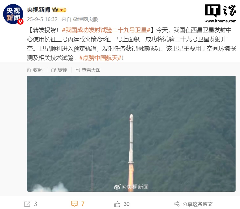 9 月 5 日消息,據(jù)央視新聞報(bào)道,北京時(shí)間 2025 年 9 月 5 日 10 時(shí) 34 分,我國(guó)在西昌衛(wèi)星發(fā)射中心使用長(zhǎng)征三號(hào)丙運(yùn)載火箭 / 遠(yuǎn)征一號(hào)上面級(jí),成功將試驗(yàn)二十九號(hào)衛(wèi)星發(fā)射升空,衛(wèi)星順利進(jìn)入預(yù)定軌道,發(fā)射任務(wù)獲得圓滿(mǎn)成功。