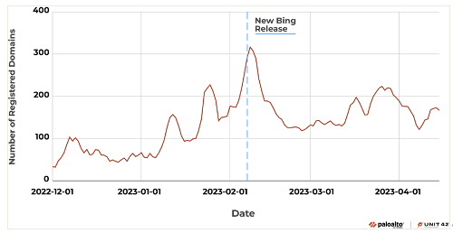 圖1展示了ChatGPT問世后相關(guān)搶注域名注冊的趨勢。研究期間,Unit 42注意到每天的域名注冊量發(fā)生顯著上漲。今年2月7日,在微軟發(fā)布新版必應(yīng)后不久,就有超過300個(gè)與ChatGPT相關(guān)的域名被注冊。