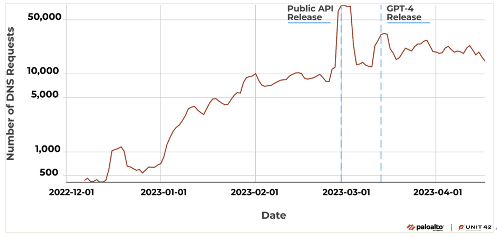 圖2的趨勢類似,對ChatGPT的接受和普及導(dǎo)致DNS安全服務(wù)日志紀(jì)錄明顯增加。