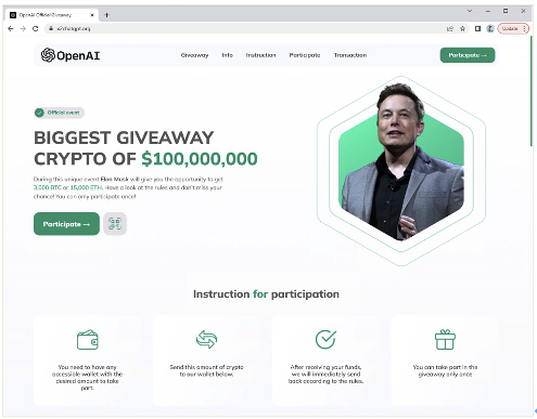 Unit 42還注意到,一些詐騙者利用OpenAI的日益普及進(jìn)行加密貨幣詐騙。圖6顯示的是通過濫用 OpenAI 標(biāo)志和馬斯克的名字吸引受害人參加一項(xiàng)贈(zèng)送加密貨幣的欺詐活動(dòng)。