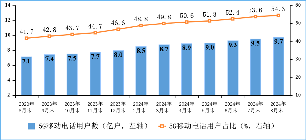 5G用戶規(guī)模持續(xù)擴(kuò)大。截至8月末,三家基礎(chǔ)電信企業(yè)及中國(guó)廣電的移動(dòng)電話用戶總數(shù)【注1】達(dá)17.78億戶,比上年末凈增3452萬戶。其中,5G移動(dòng)電話用戶達(dá)9.66億戶,比上年末凈增1.44億戶,占移動(dòng)電話用戶的54.3%,占比較上年末提高7.7個(gè)百分點(diǎn)。