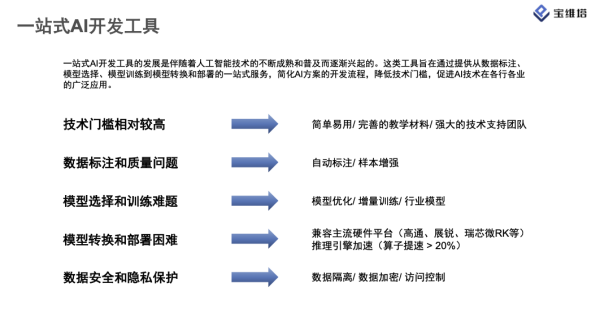 然而,對于很多企業(yè)來說,專業(yè)領域AI模型從開發(fā)到落地的每一環(huán)都絕非易事。一般而言,主要分為數(shù)據(jù)分析和數(shù)據(jù)標注、模型選擇、訓練框架選擇和模型訓練、模型轉換、模型部署這五個步驟,而每個步驟中都存在實操過程中的難點,像是數(shù)據(jù)標注過程要根據(jù)數(shù)據(jù)特點確定檢測類型,又比如模型的選擇本質上是一個折中或妥協(xié)的過程,要根據(jù)場景需求選擇最合適的算力終端。另外在模型轉換的過程中也會涉及到不同的硬件平臺,對應支持的格式也存在差異。