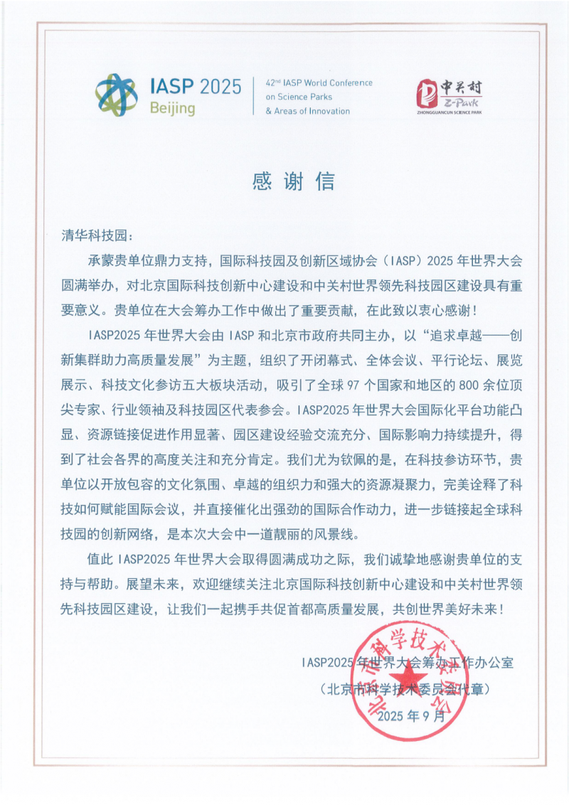 【榮耀時(shí)刻】近日,啟迪之星接連收到來(lái)自國(guó)際科技園及創(chuàng)新區(qū)域協(xié)會(huì)(IASP)2025年世界大會(huì)籌辦工作辦公室的三封特殊感謝信——分別致謝清華科技園、孵化企業(yè)北京硅基公園科技有限公司、園區(qū)企業(yè)北京智譜華章科技有限公司!作為本次大會(huì)B2B活動(dòng)的核心承辦方,我們倍感榮幸,更深知這份認(rèn)可背后承載著怎樣的責(zé)任與使命。今天,讓我們一同回顧這場(chǎng)跨越國(guó)界的科創(chuàng)盛宴,感受啟迪之星如何以專(zhuān)業(yè)之力架設(shè)全球創(chuàng)新橋梁!