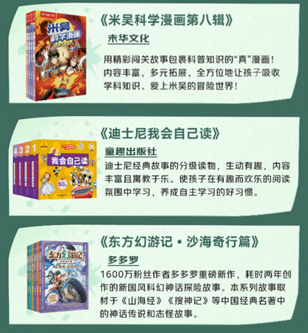 若你想給孩子選讀物,為日常添趣味,這三本書堪稱優(yōu)質(zhì)之選。由未華文化打造的《米吳科學漫畫第八輯》,以精彩的闖關故事為載體,將科普知識巧妙融入其中,打造出“真”漫畫質(zhì)感,讓科普學習不再枯燥。由童趣出版社推出《迪士尼我自己會讀》,書中內(nèi)容生動有趣、豐富多樣,為孩子的閱讀啟蒙與成長助力。《東方幻游記・沙海奇行篇》的作者多多羅以《山海經(jīng)》《搜神記》等中國經(jīng)典名著中的神話傳說、志怪故事為創(chuàng)作根基,結(jié)合巧思與創(chuàng)新,為孩子帶來全新的有趣故事!