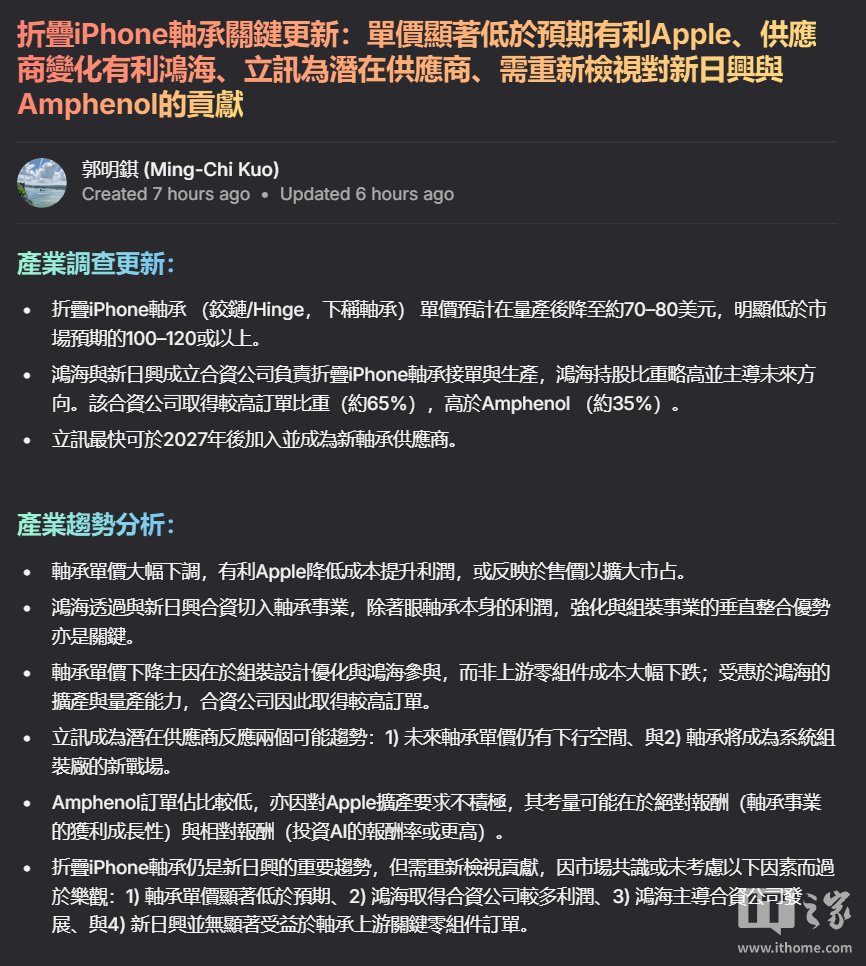郭明錤:蘋果 iPhone Fold 鉸鏈成本低于預(yù)期,立訊精密有望成供應(yīng)商