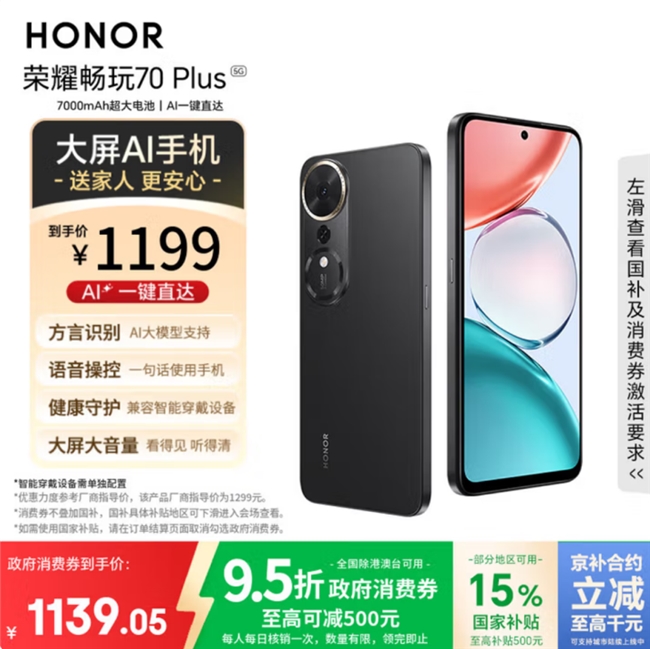 京東大屏AI手機(jī)榮耀暢玩70 Plus是京東聯(lián)合榮耀,通過C2M反向定制模式,打造的首款大屏AI手機(jī)。手機(jī)側(cè)面配備了實(shí)體AI鍵,清理加速、調(diào)整亮度、掃一掃等常用功能一鍵搞定;可以用語音點(diǎn)外賣、買藥、買菜,手機(jī)會自動跳轉(zhuǎn)到京東APP完成搜索,消費(fèi)者可以直接下單。AI語音還可識別方言,即使不太會說普通話,也能用AI語音方式完成操作。這款手機(jī)京東11.11享政企雙補(bǔ)至高直降60元,到手至低1139元,還享3期免息補(bǔ)貼,送家人更安心。