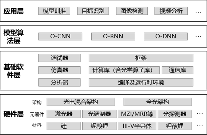 光計(jì)算技術(shù)架構(gòu)包括硬件層、基礎(chǔ)軟件層、模型算法層和應(yīng)用層,整體架構(gòu)和內(nèi)容仍在持續(xù)完善過程中。