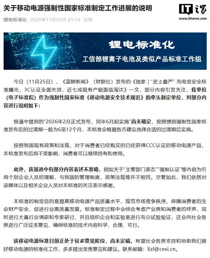 中國電子技術(shù)標(biāo)準(zhǔn)化研究院回應(yīng)“充電寶 3C 認(rèn)證全面失效”:已購買認(rèn)證產(chǎn)品不受新標(biāo)準(zhǔn)影響