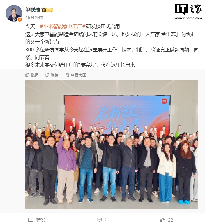 11 月 27 日消息,小米集團(tuán)大家電部總經(jīng)理單聯(lián)瑜在微博發(fā)文稱(chēng),今天小米智能家電工廠研發(fā)樓正式啟用。