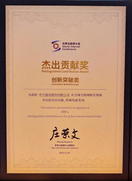 喜報!中興通訊榮獲2025年世界互聯(lián)網大會杰出貢獻獎