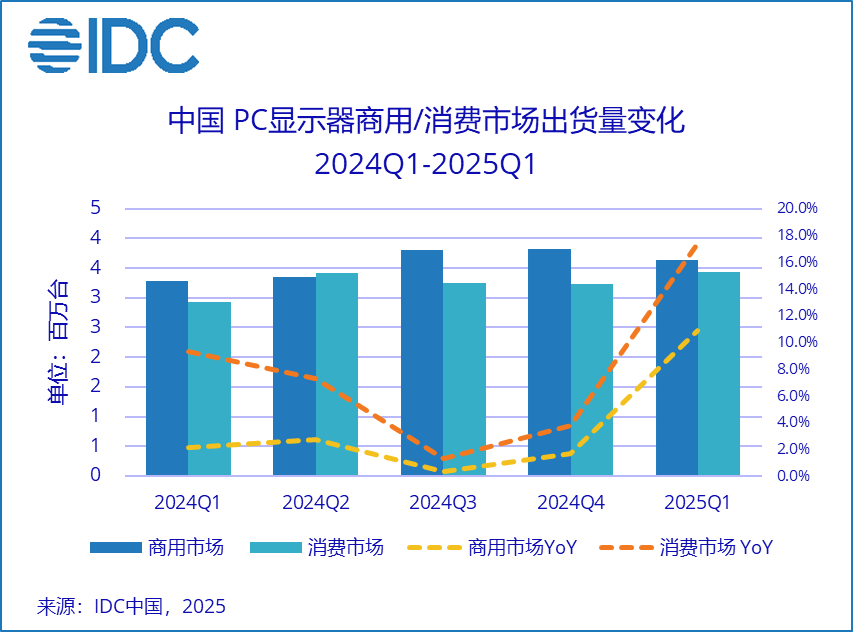 6 月 23 日消息,國際數(shù)據(jù)公司(IDC)今日通過公眾號發(fā)布《中國 PC 顯示器市場季度跟蹤報告》,IT之家從數(shù)據(jù)中獲悉,2025 年一季度中國 PC 顯示器市場總出貨量 707 萬臺,同比增長 14.0%。其中消費市場在“國補”政策的驅(qū)動下出貨量達(dá)到 343 萬臺,同比增長 17.4%。商用市場規(guī)模持續(xù)擴(kuò)大,一季度商用市場出貨量達(dá)到 364 萬臺,同比增長 10.9%。