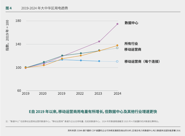 從所有行業(yè)在2019年—2024年的碳排放量來看,移動(dòng)數(shù)據(jù)流量上漲188%,固定寬帶連接上漲43%,電力行業(yè)排放上漲22%,數(shù)據(jù)中心電力使用上漲75%。但是根據(jù)2024年收集的初步信息,中國(guó)的運(yùn)營(yíng)排放量卻相比去年下降了4%,此前在2019至2023年間,運(yùn)營(yíng)排放量增長(zhǎng)了7%。