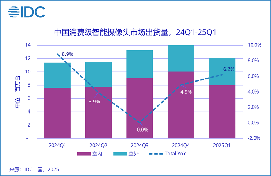 6 月 25 日消息,國際數(shù)據(jù)公司(IDC)今日發(fā)布的《全球智能家居設(shè)備市場季度跟蹤報告,2025 年第一季度》顯示,2025 年第一季度全球智能攝像頭市場(包含消費級室內(nèi)和室外攝像頭,含運營商渠道)出貨 3386.6 萬臺,同比增長 4.6%,增速持續(xù)放緩。