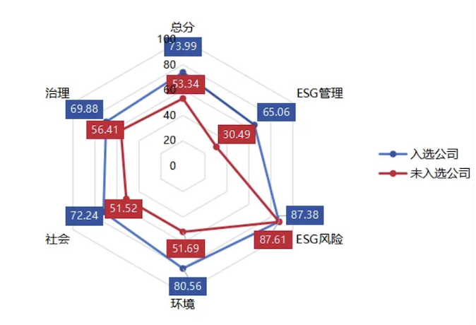 在此背景下,“行穩(wěn)致遠(yuǎn)”不僅是應(yīng)對外部環(huán)境不確定性的必然選擇,更是企業(yè)穿透短期波動、構(gòu)筑核心競爭力的戰(zhàn)略主張!缎蟹(wěn)致遠(yuǎn):中國企業(yè)ESG領(lǐng)先者報告 2025》基于商道融綠ESG評級體系,從ESG評級A-以上的A股上市企業(yè)范圍中,基于優(yōu)中選優(yōu)的原則,按各行業(yè)中排名前10且近三年無重大ESG風(fēng)險事件的條件,最終有138家入選,入選數(shù)量占A股總數(shù)的2.6%,市值占比19.7%。下圖對比了入選和未入選企業(yè)的平均ESG表現(xiàn),入選企業(yè)ESG平均得分為73.99分。E/S/G三個維度中,入選企業(yè)均體現(xiàn)了顯著的領(lǐng)先優(yōu)勢,其中環(huán)境維度更為突出,平均分高于未入選企業(yè)28.87分。