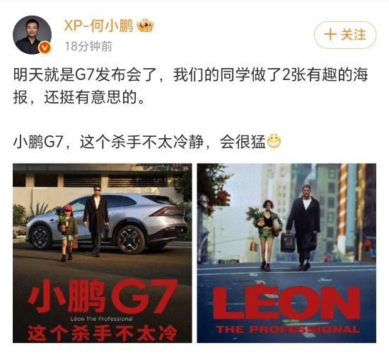 他表示,“我們把「既要又要」的產品理念放在了25萬的小鵬G7身上,讓更多人在體驗科技樂趣的同時,也能滿足家人的幸福體驗,希望大家喜歡!蓖瑫r,他還曬出模仿電影《這個殺手不太冷》拍攝的海報,海報下沿標注“7月3日北京上映”,預示著可能會在G7發(fā)布會上播出。何小鵬配文,“小鵬G7,這個殺手不太冷靜,會很猛”。