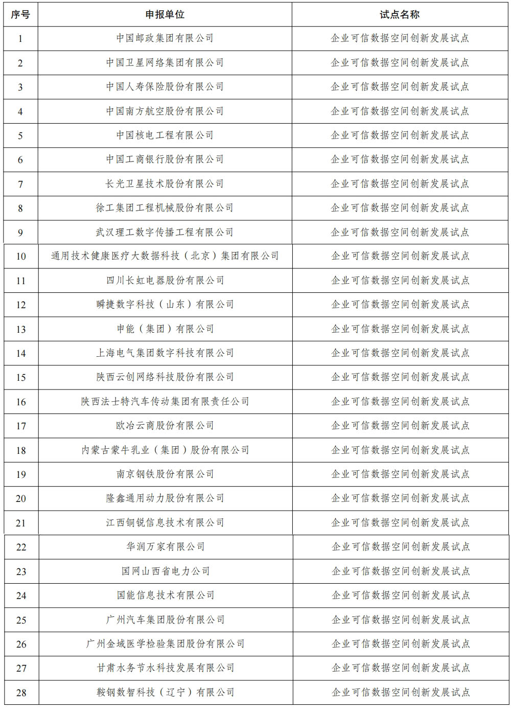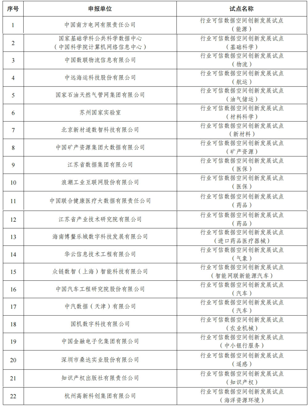 其中,上海數據集團有限公司、南京大數據集團有限公司、貴州大數據產業(yè)集團有限公司、中國南方電網有限責任公司、浪潮工業(yè)互聯(lián)網股份有限公司、中汽數據(天津)有限公司、中國衛(wèi)星網絡集團有限公司、中國南方航空股份有限公司等分別入選城市、行業(yè)和企業(yè)試點名單。