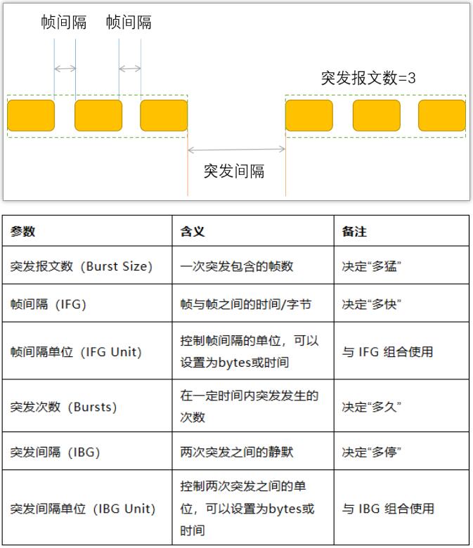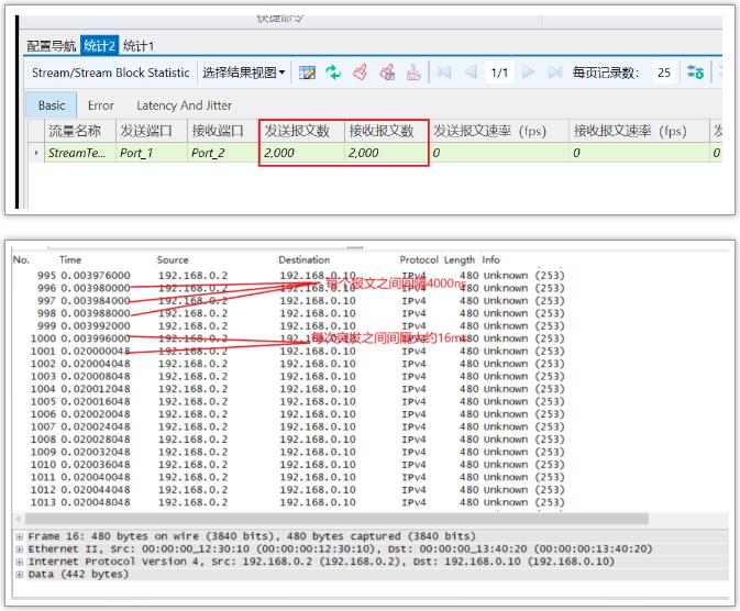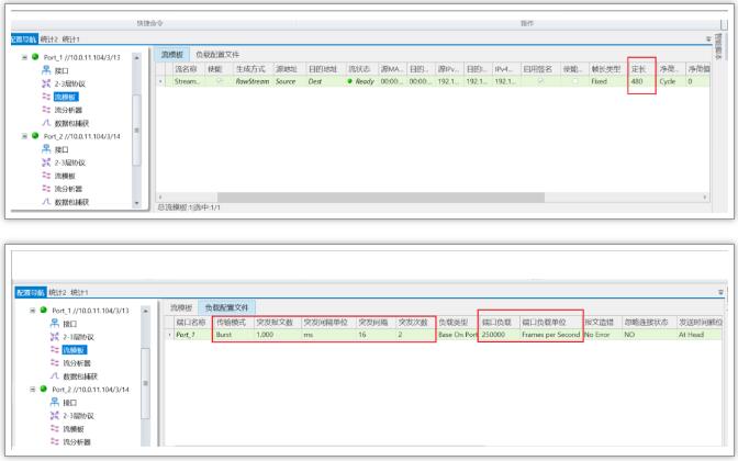 在1G端口的端口模式下創(chuàng)建一條480 Bytes線速突發(fā)流量,打4 ms,停16 ms(突發(fā)間隔),發(fā)送2次突發(fā)流。