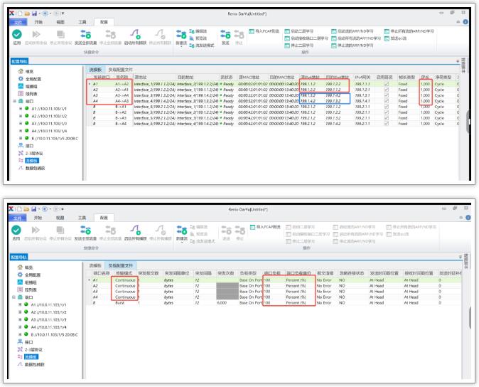2. 性能測試儀與DUT板卡A相連的m個端口兩兩一對,互發(fā)線速背景流(包長1000bytes)。