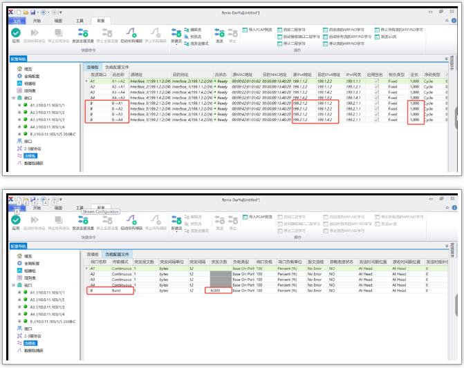 3. 配置測試儀表與板卡B相連的端口的數(shù)據(jù)流,使其發(fā)送Burst流量(包長1000bytes),Burst流量均勻發(fā)送給測試板卡A的m個端口,并且Burst流量的總字節(jié)數(shù)=板卡的緩存大小。