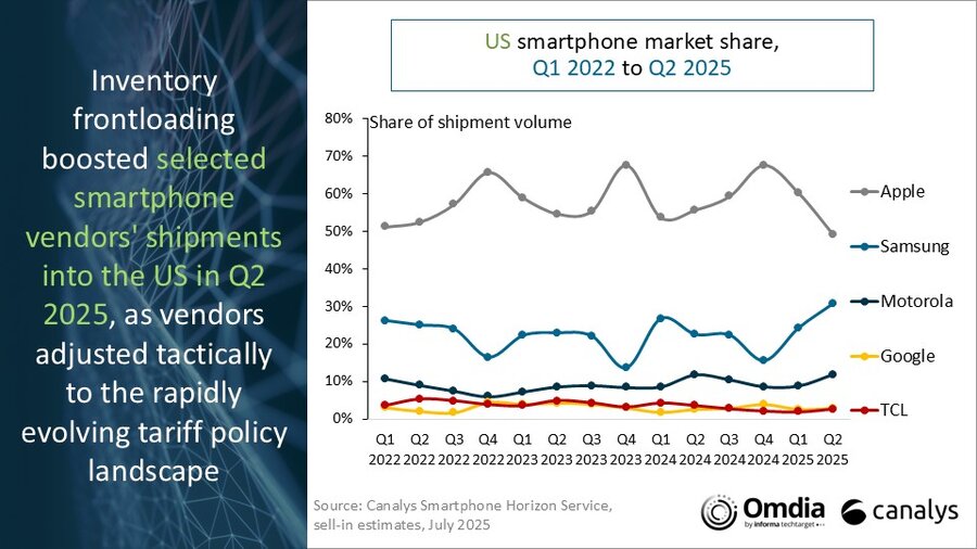 美國智能手機(jī)市場在 2025 年第二季度增長 1%, 因?yàn)橛《戎圃斐鲐浟恳蜿P(guān)稅風(fēng)險(xiǎn)而激增