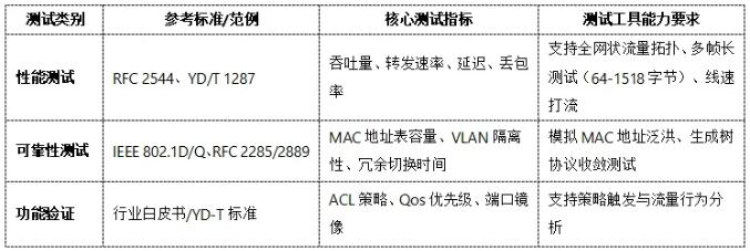 ● 測(cè)試方法的設(shè)計(jì)與選用:根據(jù)被測(cè)設(shè)備類型及性能指標(biāo)特性,精準(zhǔn)匹配行業(yè)權(quán)威測(cè)試標(biāo)準(zhǔn),例交換類的優(yōu)先采用RFC 2544(網(wǎng)絡(luò)設(shè)備基準(zhǔn)測(cè)試通用方法論),或參照數(shù)通行業(yè)規(guī)范《YD/T 1141-2022 以太網(wǎng)交換機(jī)測(cè)試方法》。而當(dāng)被測(cè)設(shè)備是路由器時(shí)則切換至《YDT 1098-2009 路由器設(shè)備測(cè)試方法》等專項(xiàng)標(biāo)準(zhǔn)。