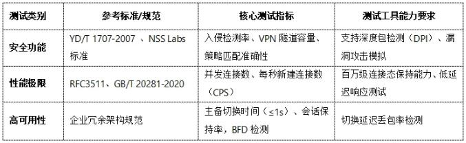性能測(cè)試:采用現(xiàn)行有效RFC標(biāo)準(zhǔn),規(guī)避過(guò)時(shí)方法,RFC 2544(已替代RFC 1242),測(cè)試聚焦:吞吐量/時(shí)延/丟包率等流量模型驗(yàn)證,應(yīng)用層(防火墻類)設(shè)備需疊加YD/T 2405-2017(新建連接數(shù)/并發(fā)能力)在相關(guān)標(biāo)準(zhǔn)的適用范圍內(nèi)進(jìn)行參考。