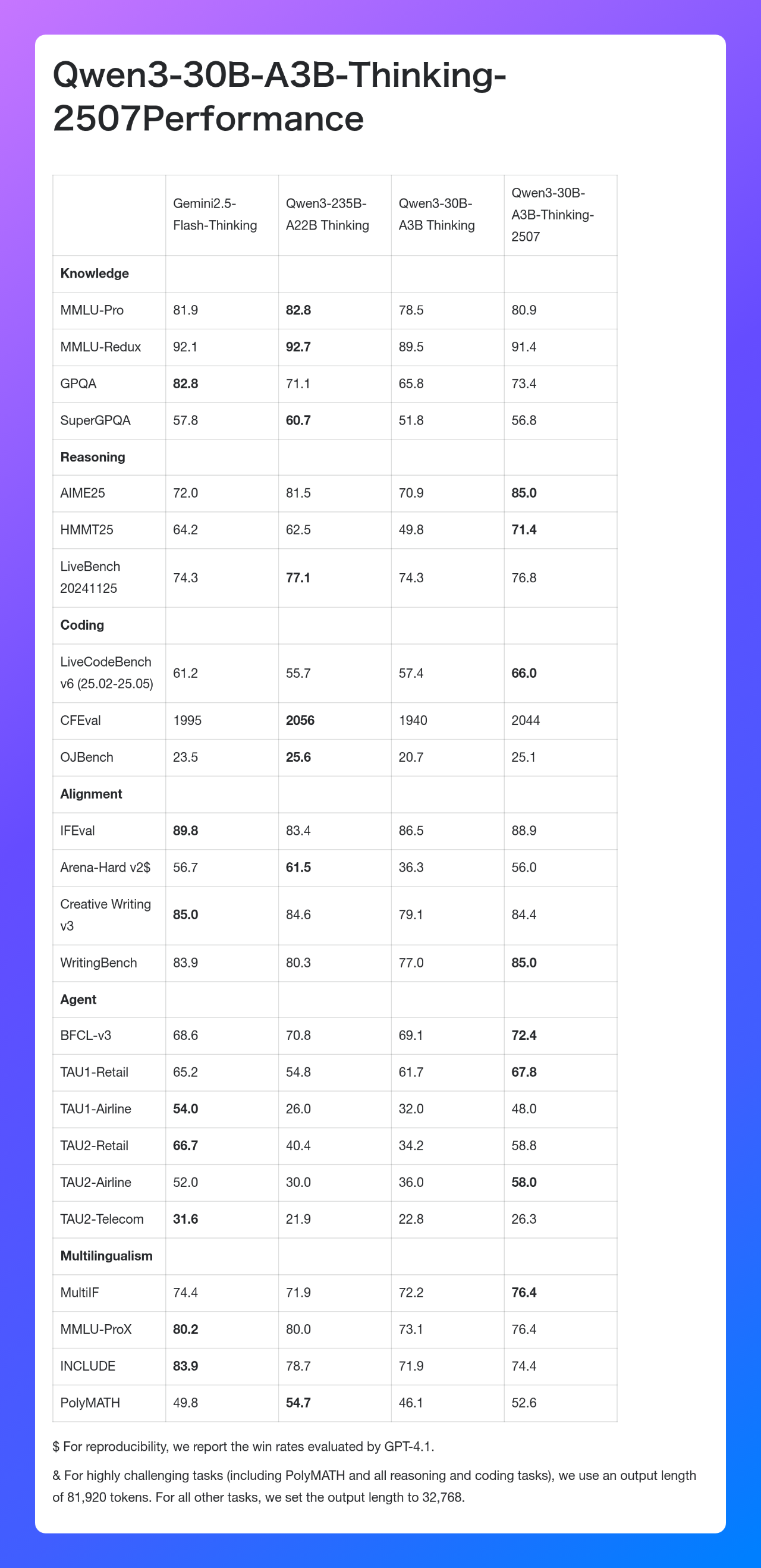 在寫作(WritingBench)、Agent 能力(BFCL-v3)、多輪對(duì)話和多語(yǔ)言指令遵循(MultiIF)等通用能力評(píng)測(cè)中,Qwen3-30B-A3B-Thinking-2507 均超越 Gemini2.5-Flash(thinking)、Qwen3-235B-A22B(thinking)。