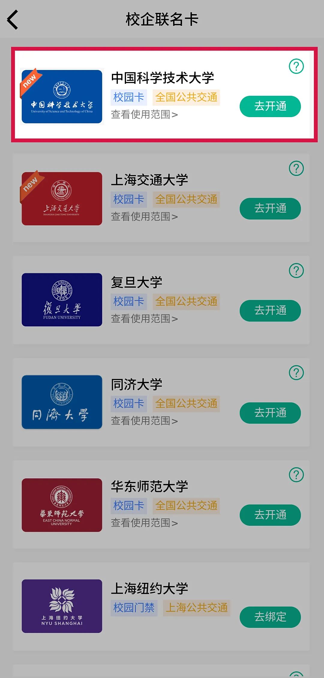 安裝“上海交通卡”App:通過官方應(yīng)用市場安裝“上海交通卡”App,按提示注冊并登錄。無需實(shí)名認(rèn)證及充值。登錄后依次找到我的 → 校園聯(lián)名卡 → 中國科學(xué)技術(shù)大學(xué),按提示完成空中發(fā)卡。個(gè)別系統(tǒng)發(fā)卡時(shí)間較長,請耐心等待不要關(guān)閉應(yīng)用。